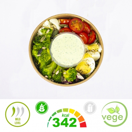 Składniki: brokuł, JAJA, pomidor, majonez [olej roślinny, JAJA, ocet, musztarda (woda, GORCZYCA, ocet, sól, cukier, przyprawy, aromat), cukier, sól, przyprawy], JOGURT, pietruszka, pestki dyni, pestki słonecznika, sałata [cykoria endywia, sałata fryzyjska, cykoria sałatkowa radicchio, rukola], czosnek, cytryna, przyprawy.